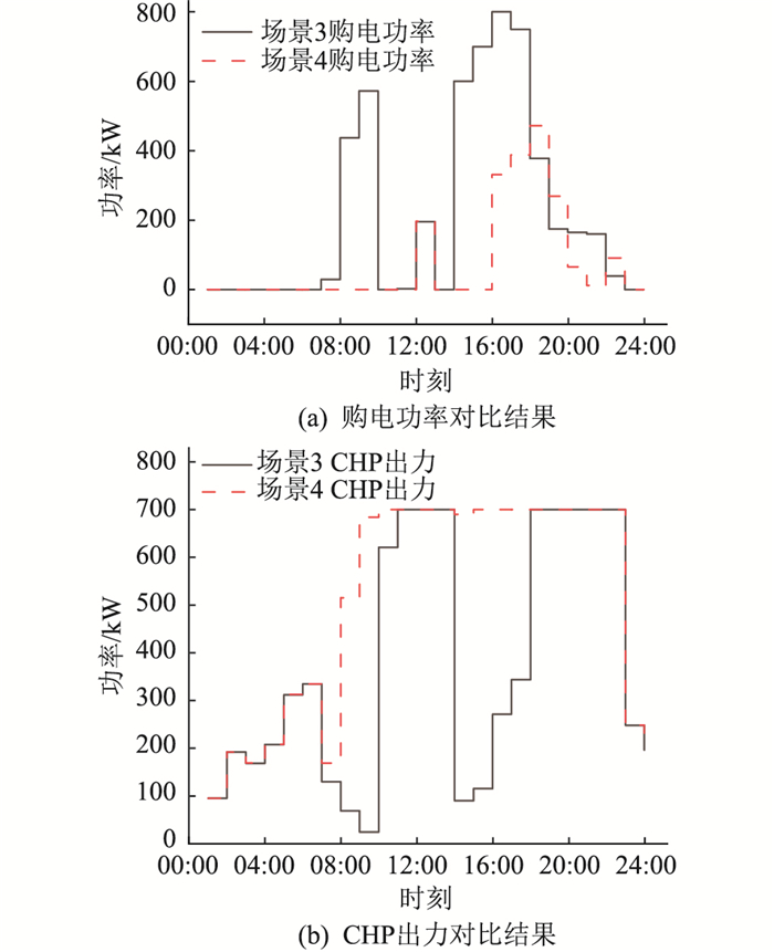 图 5 场景3和场景4的购电功率和CHP出力情况对比 Fig. 5 Comparison of purchased power and CHP output in scenario 3 and scenario 4 |