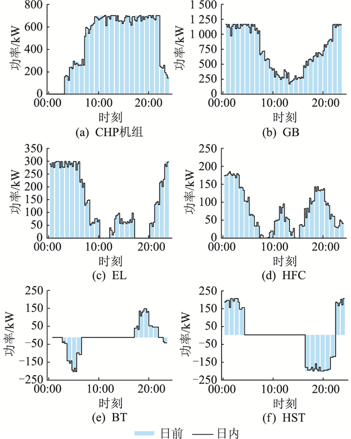 由于日前调度与日内调度的时间尺度和源、荷预测信息的差异较大,日内调度中各设备可以通过调整自身的出力大小,使IES内多种设备参与到功率波动平抑过程中。以图 7(c)的EL对比结果为例,在日内调度策略下,EL的输出功率在遵从日前调度出力状态的基础上,通过调整自身设备出力大小来平抑功率波动。