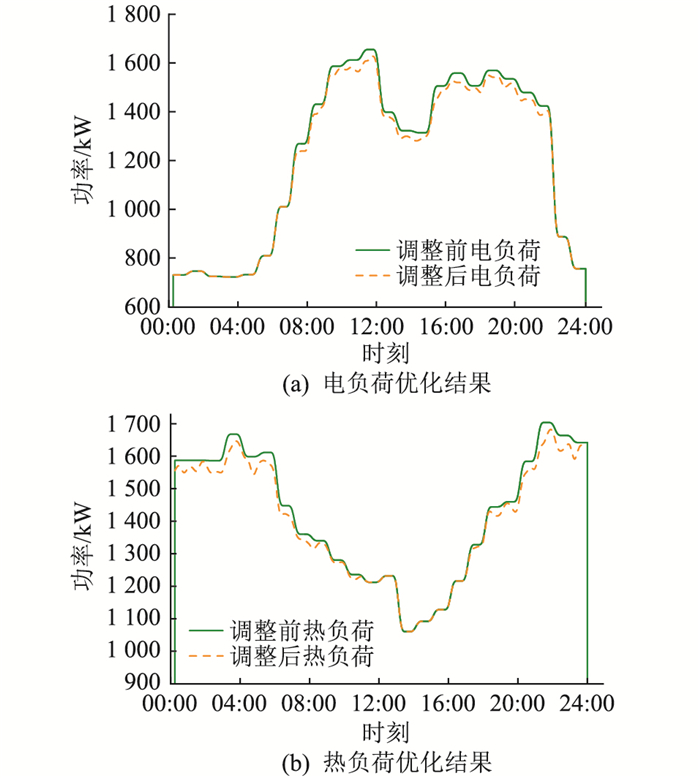 图 9为考虑日内激励型IDR策略前后的电、热负荷优化对比结果。由于日内调度中各能源设备出力调整的惩罚成本较高,功率波动也较大。在日内滚动优化调度中引入激励型电、热柔性负荷,可使用户通过调整自身用能策略来缓解系统功率波动,让用户也参与到功率波动平抑过程中。由图 9(a)可以看出,在09:00—13:00以及17:00—23:00等电负荷较高时段,由于此时负荷需求较高,机组出力较大,因此其对应的设备调整量也较大。IES为了减少设备调整量,通过给予用户一定的激励补贴,使用户根据激励政策调整自身的用电策略,因此该时段的电、热负荷出现不同程度的削减。而在23:00—06:00等电负荷谷时段,设备调整量较低,因此该时段用户负荷未出现削减。同理,热负荷的优化结果与电负荷类似。