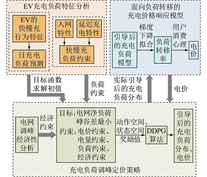 1 调峰定价策略实现框架调峰定价策略的总体流程如图 1所示。首先,在EV充电负荷特征分析中,基于快慢充行为特征的统计数据对未来的日充电负荷进行预测,将预测的充电负荷分布作为引导前的EV基础日充电负荷。其次,针对EV慢充的入网特性和快充的延迟充电特性进行分析,建立快慢充负荷约束,并分析电网调峰经济性,建立电网扶持调价的经济约束。再次,以电网净负荷峰谷差最小为目标构建充电引导模型,结合约束条件采用DDPG算法对引导模型进行学习求解,求解得到的值作为实际引导后的EV日充电负荷。最后,基于梯度下降法对引导后的充电负荷模型进行拟合,从而获取负荷转移率,并引入用户消费心理建立充电负荷价格响应模型,将转移率转化为电价作为算法的输出,经过反复的学习迭代即可获取最优电价。