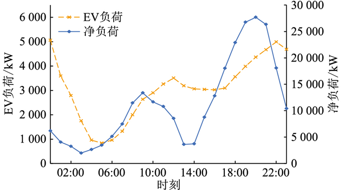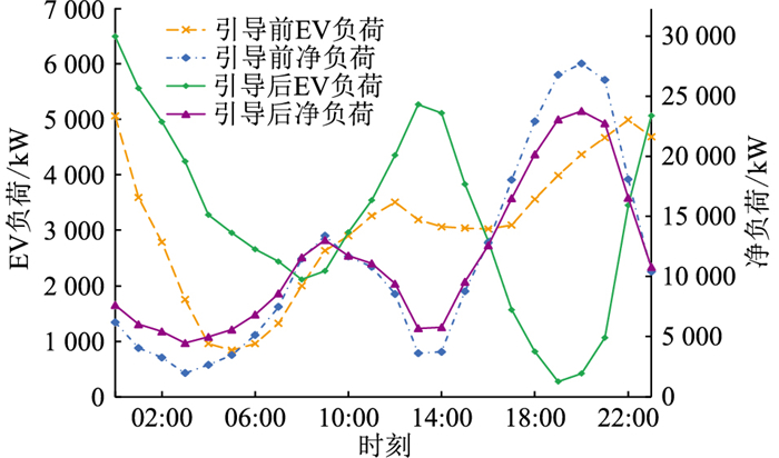 以缩小净负荷峰谷差为目标,对EV进行充电引导,引导后的EV充电负荷与净负荷如图 10所示。