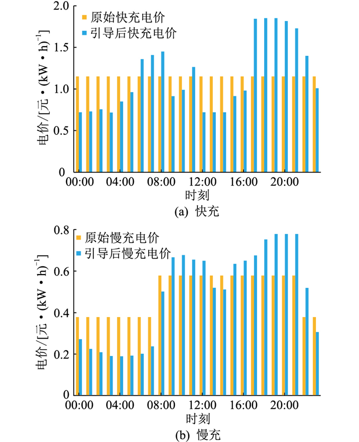 图 12 引导前后EV快充和慢充的电价 Fig. 12 Electricity price of fast and slow charging of EVs before and after guidance |
