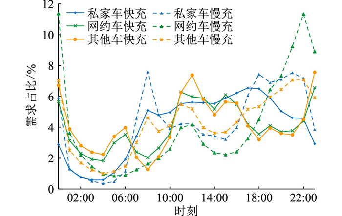 现如今EV主要可分为私家车、网约车和其他车(如客车和物流车)。由于这些车辆在社会功能上存在差异,其出行规律和充电负荷也有所不同。分析EV充电负荷的关键在于确定其出行时间、充电需求、充电方式以及荷电状态(state of charge, SOC)[18]。文中以文献[19]为基础,得到了各类EV在各时刻的快充和慢充需求占比,如图 2所示。