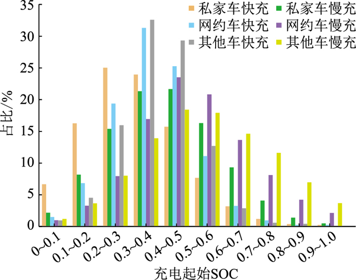 各类型车辆快慢充需求下的充电起始SOC占比如图 3所示。总体来看,各类型车辆倾向于在SOC较低时选择快充方式,而在SOC较高时选择慢充方式。
