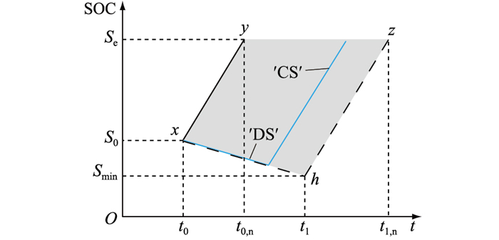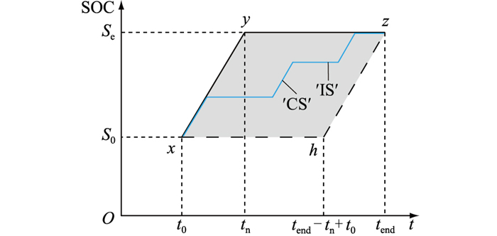 在慢充EV接入电网这段时间内,单体EV运行区域如图 4所示,假设t0、tend分别为EV开始充电时刻和结束充电时刻。图中,“xy”表示EV接入电网后立即以慢充功率Ps开始充电,直到充至Se;“yz”表示EV保持Se直到用户结束充电;“xh”表示EV接入电网后延迟充电,直到能保证EV完成充电;“hz”表示恰好在用户结束充电时刻完成充电。“xyz”表示EV运行区域的上限;“xhz”表示运行区域的下限。