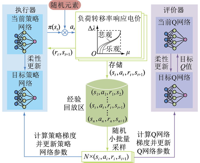 4.4 基于深度强化学习的引导模型 4.4.1 DDPG算法在充电负荷引导过程中,引导策略的设计基于环境和智能体的信息交互[25-27]。文中采用DDPG算法进行求解,具体算法流程如图 6所示,其中st、at、rt分别为t时刻的状态、动作和奖励;st+1为t+1时刻的状态;π(·)为控制策略函数;N为交互参数个数。在训练过程中,执行器从评价器的反馈中学习正确的动作,生成最优控制策略,即在每个状态st下生成最优动作at,用Q(st, at)值评价;评价器的目标是找到最准确的Q值估计,从所获得的奖励中计算价值函数,以正确地评价执行器所采取的动作。通过对N个交互参数(si, ai, ri, si+1)(其中i=1, 2, …, n)进行随机批量采样,可以生成策略网络和Q网络的训练数据集,从而打破经验之间的耦合。策略产生动作指令作用到负荷转移响应电价模型中,仿真模型根据该定价策略将奖励反馈给智能体,智能体以最大奖励为目标获取最优策略。