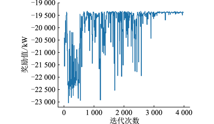 随着训练次数的变化,获得的奖励函数值见图 9。当迭代次数大约为2 500次时,奖励值得到收敛,获得电网净负荷峰谷差最优解,为19 305.19 kW。