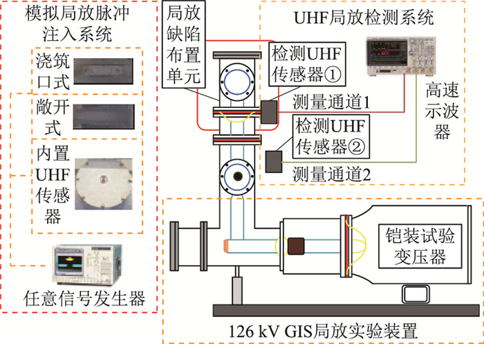 1 试验平台及方法 1.1 126 kV GIS局放UHF检测平台为分析脉冲注入模拟局放与实际局放UHF信号等效性,文中综合考虑了现场实际尖端、悬浮和绝缘子气泡典型缺陷类型及等效性,建立了包括126 kV GIS局放试验装置、局放缺陷、模拟局放脉冲注入系统和UHF局放检测系统在内的UHF局放检测平台,主要包括以下部分: