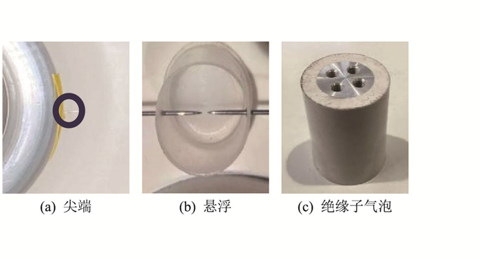 悬浮缺陷:将2个直径1 mm、长度8 mm、尖端为曲率半径0.75 mm倒角的铁针通过绝缘圈固定,可调针尖距离为2 mm,放置在图 1中局放缺陷布置单元的盆式绝缘子上,距离高压电极约为1 cm处,以模拟悬浮缺陷。