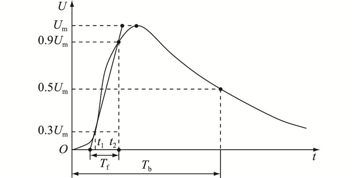 用高性能任意信号发生器(采样率8 GS/s,8位D/A分辨率)向UHF传感器注入恒定参数的双指数脉冲信号模拟GIS内部局放,如图 3所示,其中注入双指数脉冲信号[5, 14]半峰值时间Tb为20 ns;t1、t2分别为信号到达30%、90%峰值的时刻;波前时间Tf为0.5 ns;峰值Um为2 V。模拟局放试验中,UHF局放检测平台不加电压。根据UHF在线监测装置现场校验情况[19],不同耦合方式分别通过内置和外置UHF传感器注入脉冲信号实现,其中外置UHF传感器注入分为无金属屏蔽敞开式的盆式绝缘子边缘注入和带金属屏蔽绝缘子浇筑口注入。