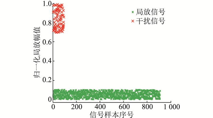 试验采集不同耦合方式下注入脉冲及实际局放缺陷的UHF信号样本总计6 000组,为提高信号计算效率,采用K-means聚类算法[23-24]对原始数据样本的干扰信号数据识别并剔除,其中悬浮放电的局放信号聚类分析提取如图 4所示,由UHF传感器①、②局放检测的干扰避免方法可知,局放信号数据与干扰信号数据的幅值存在较大差异,可比较UHF传感器①、②的UHF脉冲信号幅值,得出图 4中幅值0.7~1.0为干扰信号数据,幅值0~0.1为局放信号数据。
