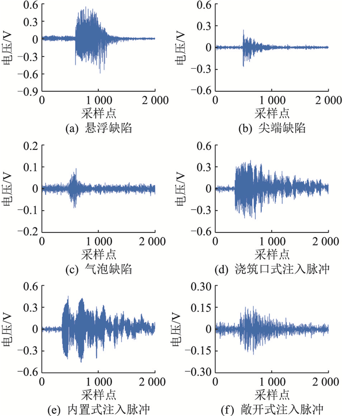 2 基于经验模态分解的加权IMF的UHF信号等效性分析方法 2.1 UHF信号归一化处理悬浮、尖端、绝缘子气泡缺陷和不同耦合方式下注入脉冲模拟局放的UHF原始信号见图 5,UHF单脉冲信号采集时间为1 μs,共有2 000个采样点。
