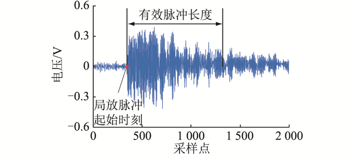 式中:s′ k为能量差值;sk为能量累计值;p为每点的平均能量;un为信号电压幅值;k为曲线采样点序列;n=1,2,3, …, k,…,N。为保证提取的UHF信号脉冲长度保持一致,考虑到UHF原信号的长度为2 000以及信号脉冲的持续时间,故信号脉冲提取长度为1 000,UHF局放信号有效脉冲提取见图 6。