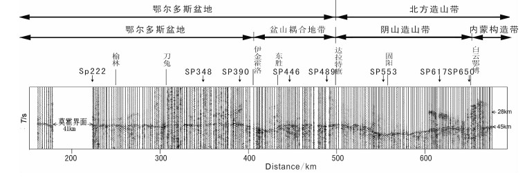 鄂尔多斯盆地速度分布横向变化不大,纵向为弱正速度梯度,接近Moho界面为强正速度梯度,厚约26 km.盆山耦合地带的下地壳为速度的强烈变化区,且Moho界面局部上隆,显然不同于其南、北两侧地带,这里好似一“透明”的地壳.阴山造山带地壳内部速度较为均匀,在近Moho界面时,为纵向强速度梯度层,厚度为45~46 km,在整体地壳中亦未见速度变异界面.