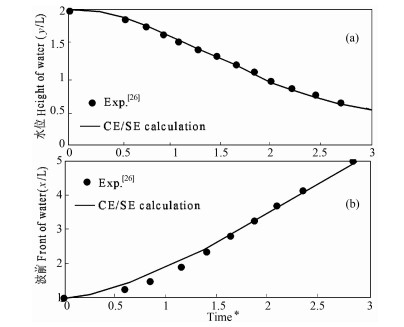 6 应用 6.1 溃坝流问题计算本文以溃坝流[26]为例,验证提出的孔隙介质中多相流动的CE/SE计算方案.矩形水槽底部长5L、壁高2.5L.初始时刻用挡板在水槽左侧截取高为2L、长为L的水柱,其余部分与空气接触,挡板突然抽出之后,水柱将坍塌并沿水槽底部向前流动,水与背景流体的密度比为1000,黏性比为100[26].