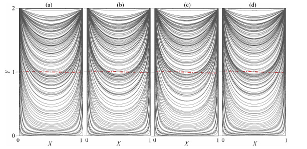 Da=0.01时流动更慢(图 8),剪切能量完全被界面运动消耗,界面上未能产生次生涡,上层流体只在中心形成一个主涡,界面几乎保持水平.以上计算表明,双层流体顶盖驱动方腔流的流态主要受达西数的控制.