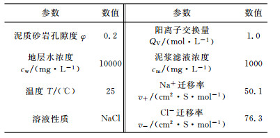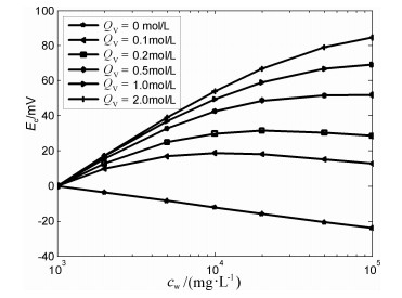改变阳离子交换量QV可以计算阳离子交换量对薄膜电位的影响.从图 8可以看出,当泥浆滤液浓度与地层水浓度一定时,薄膜电位随阳离子交换量的增大而增大,但增长的幅度逐渐变小.另外,薄膜电位随阳离子交换量增加的幅度与地层水浓度的高低有关,地层水浓度较低时幅度较小,地层水浓度较高时幅度较大.