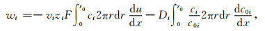 式中,Di=RTvi为扩散系数;vi为第i组分离子迁移率;ci为第i组分的浓度;u为空间电位.将式(16)沿毛细管截面积分,得毛管内第i组分的离子流量为[10]