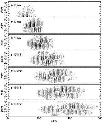 3.2 垂直风扰动图 4为例1中不同时刻密度加权的垂直风扰动ŵ=(ρ0/ρs)-1/2w′,其中ρs为下边界处背景大气密度,图中虚线代表垂直风扰动小于零,等值线的间隔为0.01m·s-1.背景大气温度波导中心高度为30km,半宽为10km,从图 4中可以看到,由下边界强迫引起的扰动在第10min时就开始进入波导区域,垂直风扰动达到约50km的高度.在第40 min时,下边界处扰动能量已经全部进入了波导区域,在数值模拟的时间内,重力波在垂直方向上始终被限制在10~50km的高度范围内,而且波包结构清晰,由此可认定此时的重力波发生了良好的导制传播.随着重力波在水平方向上向右的传播,波包水平扰动区域逐渐变大,波结构略有变化.第40 min时的波结构在波导区域内没有节点(ŵ=0),波结构大致关于波导中心高度z0=30km对称.第100min时,在波包的前列出现了一些垂直尺度较小的波结构,这些波结构在约30km高度附近存在着波节点.重力波在导制传播时,垂直风扰动的振幅逐渐减小.第40min时,波导区域内ŵ的最大值约为0.14m·s-1,而到了第190min时,波包向右传播了很长一段距离,ŵ的最大值减小到约为0.07m·s-1,此时400~500km区域内波结构ŵ的最大值约为0.02m·s-1.
