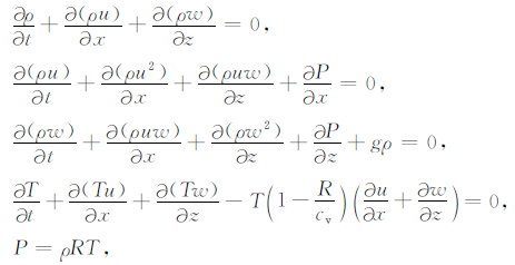 其中,x和z分别是水平和垂直方向坐标;u和w分别是水平和垂直风速;ρ、P和T分别是密度、压强和温度;R为普适气体常数(R=286.98J·kg-1· K-1);cv为定容比热(cv=781J·kg-1·K-1);g为重力加速度常数(g=9.80225m·s-2).