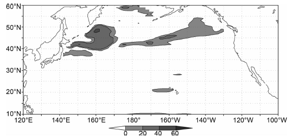 图 6为计算(6)式的预报技巧.可看出,在热带海域(10°N~15°N),Rossby波动力模型可以解释海表面高度年际变化的20%~60%.在中纬度的日界线附近(170°E~155°W),预报技巧在20%~40%之间.在高纬度,预报技巧大于40%的区域分布在阿拉斯加环流的东部、副极地环流的西部和日界线附近50°N~55°N海域.