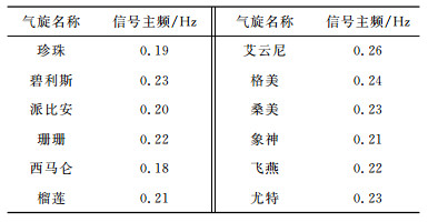 表 1 不同台风产生的震颤波信号的主频对比(广州台) Table 1 Primary frequency of tremor from different Typhoons (GZH) |
