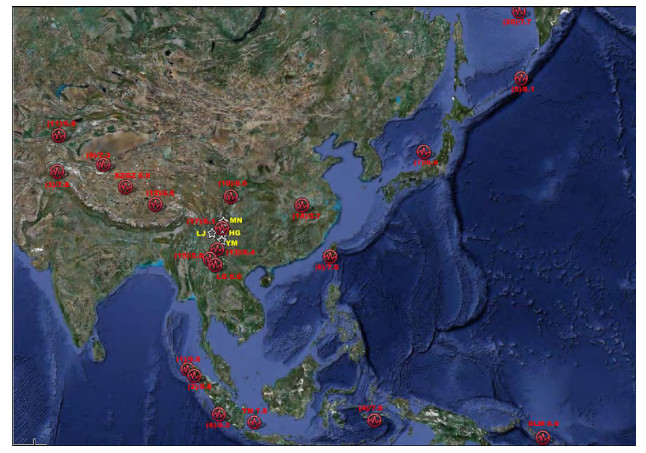 Four sets of PS100 systems has been recording at 4 stations in Sichuan and Yunnan (MN station at 28.532°N, 102.169°E, HG station at 26.544°N, 101.928°E, YM station at 25.690°N, 101.861°E, and LJ station at 26.837°N, 100.245°E) since April 2004(Fig. 1)