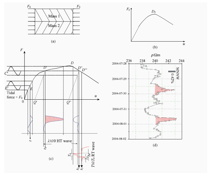 Fig. 2 Schematic diagram showing the model (mechanism) of HRT wave (a, b, c) Schematic diagram showing the model (mechanism) of HRT wave; (d) The measured HRT wave cases prior to the Ludian earthquake on 10th of August, 2004 (cf. No.16 in Table 2), which can be compared with the model. |