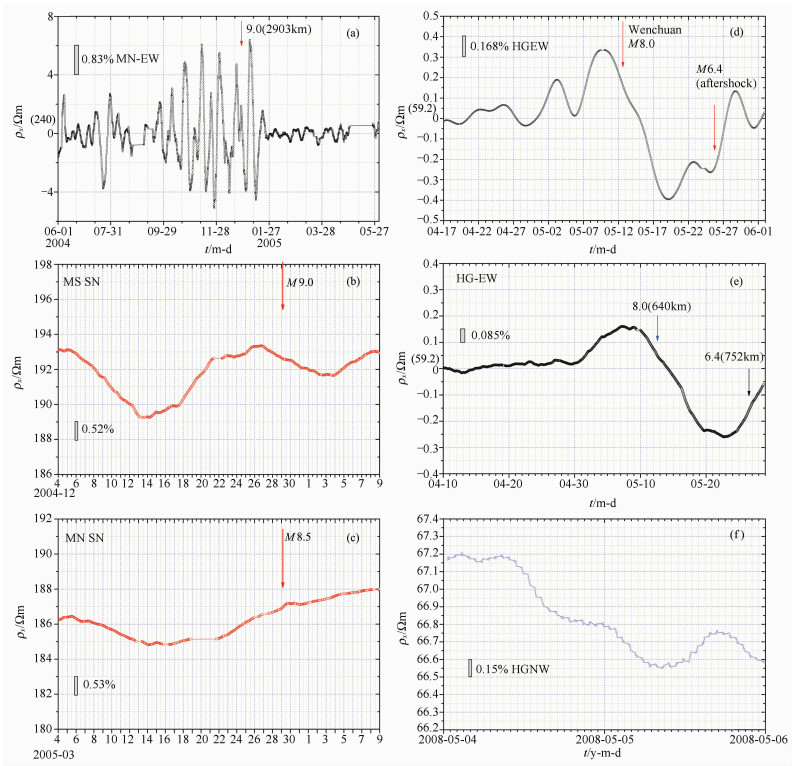 From Figs. 3d and 3e, we can see that before the Wenchuan Ms8.0 earthquake, the NW channel of HG station shows the HT half-month and three 7-day period variations with increasing amplitude (cf. No. 10 in Table 2). About 10 hours before the earthquake, the geo-resistivity decreased for about 1.0%. This is 10 times of the standard deviation of the measurement. From Fig. 3f we can see two half-day period variations indicating that the medium stiffness λ≤0. That is, from 4 May 2008 to 6 May 2008, there are two half-day period variations indicating that the stiffness of medium in the epicentre area changes from "+" to "-" and the resonance oscillation RT wave and the earthquake is coming up.