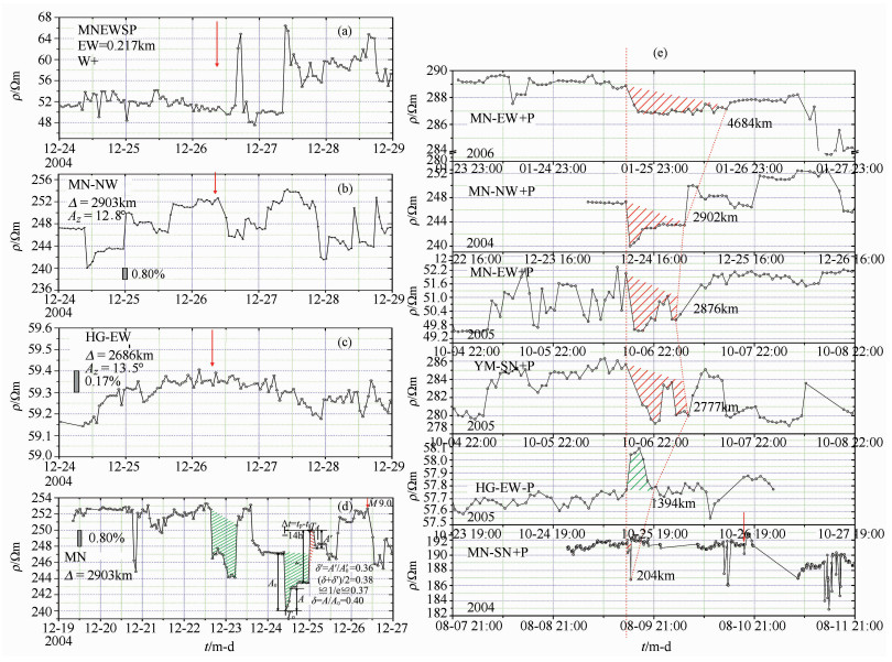 Fig. 4e compares RT waves of several earthquakes. The curves from top to bottom are the records of RT waves before the Ms7.6 Banda Sea earthquake at MN station, the M7.8 Pakistan earthquake of 2005-10-08 at YM station and at MN station2), the Ms5.7 Jiujiang earthquake at HG station and at MN station, and the M5.6 Ludian, Yunnan earthquake of 2004-08-10 at MN station, respectively. The arrival time of the primary RT waves before the earthquakes were aligned. It shows that the arrival time of the second RT wave was a function of epicentral distance of the station. In general, the arrival time of the second RT wave was delayed more greatly when the epicentral distance was larger, i.e. the arrival time difference between the primary and the second RT waves increased with the epicentral distance.