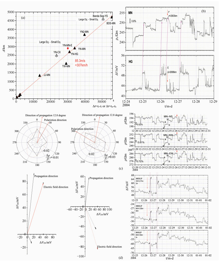 Fig. 5 Cases of RT wave and its mechanism (a) Velocity curve of geo-electric RT wave (longitudinal) and the propagation velocity related to pore pressure changes calculated from the data of large and small earthquakes; (b) The geo-resistivity measurement at MN and telluric field measured at HG two days before and one day after the Sumatra earthquake; (c) RT longitudinal and transverse waves of geo-resistivity before the Mw9.0 Sumatra earthquake and its ellipse of principal stress; (d) Vector graph of the RT longitudinal and transverse waves of geo-current field during the Mw9.0 Sumatra earthquake. |
