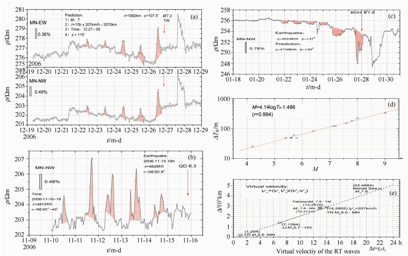Fig. 6 Cases of RT wave and its propagation (a) Case of RT wave to the two-Taiwan Ms7.0 earthquakes on December 26th, 2006;(b) Case of RT wave to the Kuril Islands Ms8.1 earthquake on November 15th, 2006;(c) Case of RT wave to the Banda Sea Mw 7.6 earthquake on January 28th, 2006;(d) The curve of earthquake magnitude (M) versus the natural period of the fault system (T0); (e) Velocity of RT virtual waves before the earthquakes. |