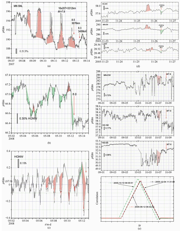 Fig. 7 RT wave cases and its regularity (a) Example from Indonesia Ms8.5 earthquake on September 12th, 2007;(b) NW channel recordings of HRT waves recorded at HG before Wenchuan Ms8.0 earthquake; (c) NW channel recordings removed from long term changes; (d) Example from the M5.7 Jiujiang earthquake of 2005-11-26 at HG, MN and LJ stations; (e) Example from the M7.8 Pakistan earthquake of 2005-10-08 at YM, HG and MN stations and three distant specification tests. |
