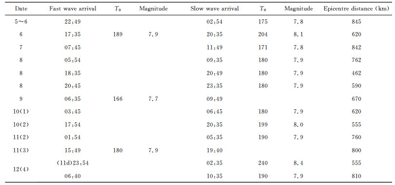 The epicentre distance estimated at different times varies between 500 and 800 km. Because the epicentre is the north of HG station, the center of the pore fluid wave might move north-south. The center on May 12th was 555 km and 810 km, respectively. If we consider this difference to be the length of the rapture L=810 -555=255 km, migrating from south to north and we assume that this represents the two ends of the fault, we can estimate the rapture length. The magnitude can then be estimated by[40]: M=3.3 + 2.1logL=8.5. This is in good agreement both with the estimation shown in Table 1 and with the result of Zhang et al.[41].