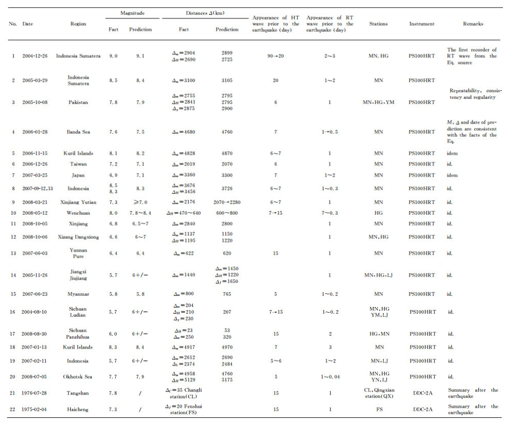 Fig. 7e shows example from the M7.8 Pakistan earthquake of 2005-10-08 at YM, HG and MN stations and three distant specification tests were conducted by the control center in Beijing on 2005-08-12, 2005-10-04, and 2005-10-10, for the working state of the PS100 system at MN station. The resut indicated that during the specified time period (August 12 to October 10, 2005), the PS100 system was stable. Therefore, the observed the HRT waves before the Pakistan earthquake are real. The magnitude and epicentre distance of prediction are consistent with the facts of the earthquake (see No.3 in Table 2).