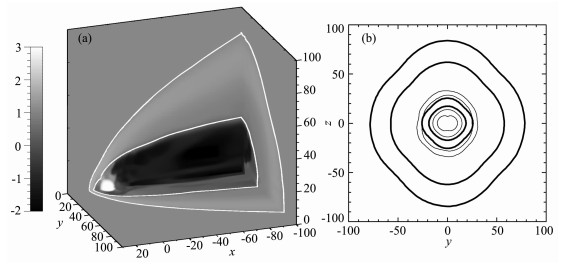 图 1 BIMF=0时的模拟结果 (a)赤道面、昼夜子午面和终端面内的lg (n)分布(n为数密度, 单位cm-3)和磁层顶和弓激波截线; (b)x=6, 0, -50, -100平面内的磁层顶和弓激波截线, 分别用细实线和粗实线表示, x越小的截线越靠外. Fig. 1 Results for BIMF=0 (a) The distribution of lg (n) (n is the number density in the untt of cm-3) and the cross sections of the magnetopause and bow shock in the equatorial, noon-midnight meridian, and terminator planes; (b) The cross sections of the magnetopause and bow shock, denoted by thin and thick solid lines respectively in the planes of x=6, 0, -50, -100 and being more outside for smaller value of x. |