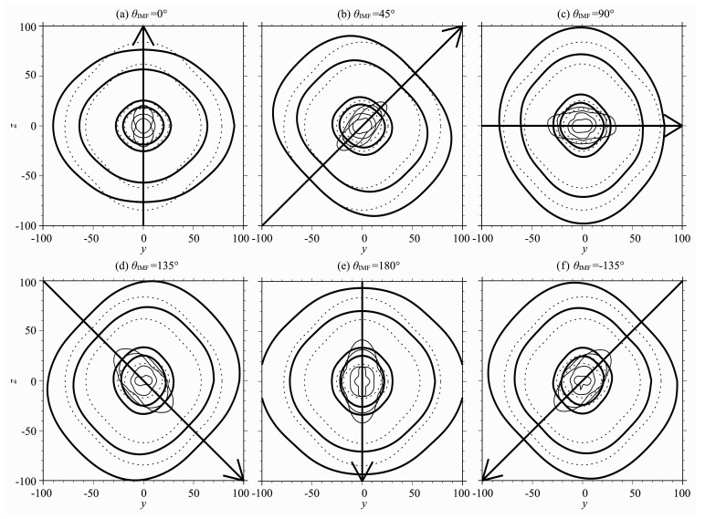 图 2 同图 1b, 但针对BIMF=10nT, θIMF=0°, 45°, 90°, 135°, 180°, -135°的模拟结果, 各分图中的箭头示出IMF的方向, 点线取自图 1b, 表示BIMF=0时的弓激波截线.对于正北IMF情况(分图(a)), 仅给出x=6, 0, -50的磁层顶截线 Fig. 2 Same as Fig. 1b but for BIMF=10 nT, θIMF=0°, 45°, 90°, 135°, 180°, -135 °. In each panel, an arrow denotes the IMF orientation and dotted curves, the cross sections of the bow shock for the case of BIMF=0, taken from Fig. 1b. Only cross sections for x=6, 0, -50 are plotted in panel (a) for the due northward IMF case |