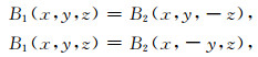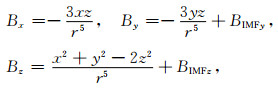 式中r=(x2 +y2 +z2)1/2为地心距离, 磁场强度以地球表面赤道处的值为单位.由上式出发, 立即可看出合成磁场的总强度相对x轴具有如下中心对称性质: