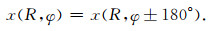 与此相应, 弓激波几何形状也具有中心对称性质.本文限于这种情况, 因而所获得弓激波的数值解均相对日地连线中心对称.利用这种中心对称性质, 可将解域限制在北半球, 即前述解域的一半(本文不利用这种对称性质, 仍在全解域进行数值模拟).在前述圆柱坐标系(R, φ, x)下, 弓激波的中心对称性质可由下式表达: