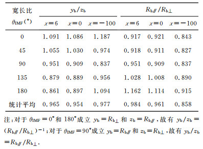 我们针对BIMF=10nT和不同θIMF下的模拟结果, 计算了3个典型x平面内弓激波截线的特征尺度参数比值yb/zb和Rb∥/Rb⊥, 结果列于表 1.表中的统计平均值, 是在IMF取向的分布各向同性的假定下求得的.从比值Rb∥/Rb⊥的数据可见, 在所有θIMF值下, 终端面尾侧(x=-100)的弓激波截线均有Rb∥/Rb⊥ < 1, 即沿IMF方向的宽度小于垂直方向.对于准北向和晨昏向IMF (θIMF=0°, 45°, 90°)情况, 终端面和向阳侧的弓激波截线也有Rb∥/Rb⊥ < 1, 即沿IMF方向的宽度同样小于垂直方向.对于准南向IMF (θIMF=180°, 135°)情况, 终端面和向阳侧的弓激波截线有Rb∥/Rb⊥ >1, 即沿IMF方向的宽度大于垂直方向.这些结果与前面按图 2得到的定性结论一致.