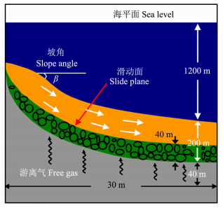 天然气水合物的形成和分解主要受温度、压力、气体类型及海水盐度的影响,当上述条件发生变化时,其赋存状态也将发生变化,因而,构造作用、海平面升降和海底工程等因素都可能破坏天然气水合物的稳定性.天然气水合物分解会产生大量的游离气,增大沉积物的孔隙压力,降低沉积物的胶结强度,使得含气沉积层的抗剪强度和承载能力降低,被液化的分解带将形成一个向下的滑动面,此时一旦受地震或者沉积载荷增大等因素触发,仅依靠沉积物自身的重量,便可引起海底滑坡.