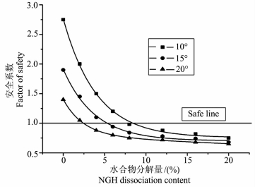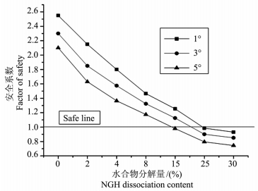 图 5表示了在不同的坡角条件下,水合物的分解量对海底斜坡稳定性的影响.由图 5可以看出,当15%的水合物分解后,坡角为5°的斜坡将发生失稳,而坡角为1°和3°的斜坡仍处于稳定状态.而当25%的水合物分解后,坡角为1°、3°、5°的斜坡都失去稳定性.图 5中,安全线以上的部分说明斜坡处于稳定状态,安全线以下的部分说明斜坡处于不稳定状态.图 5说明了水合物分解量对海底斜坡稳定性的重要影响作用.此外,通过图 5也可看出,在水合物逐步分解的过程中,相同条件下较大坡角的海底斜坡将率先发生失稳.