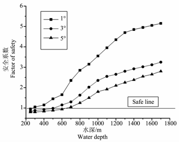 图 6 水深变化对海底斜坡稳定性的影响(15%水合物分解) Fig. 6 Effect of variation in water depth on submarine slope stability (15% gas hydrate dissociation) |