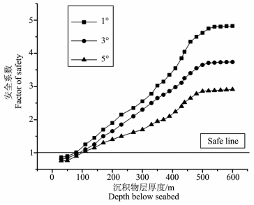 图 7表示了沉积物层中15%水合物分解的条件下,对应于不同斜坡坡角,沉积物层厚度变化对斜坡稳定性的影响.由于沉积物在自身重力的作用下,具有压实作用,因此,沉积物层厚度的增加也同样具有使海底斜坡处于稳定状态的作用.随着沉积物层厚度逐步增加,海底斜坡更加稳定.但当沉积物层的深度超出了天然气水合物赋存的稳定带底界时,探讨水合物分解对海底斜坡不稳定性的影响就失去了意义.因此,沉积物层深度的影响仅限于一定的深度范围.从图 7可看出,在沉积物层厚度小于100m的条件下,坡角为5°的海底斜坡处于不稳定的状态,说明沉积物层的压实作用在这时候表现得不明显,当沉积物层厚度大于100m后,其对海底斜坡稳定性的保持作用才显著地表现出来,这时,1°、3°与5°坡角的海底斜坡均处于稳定状态.沉积物层厚度的增加对海底滑坡的产生同样具有抑制作用.