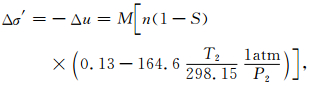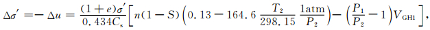 式(1)中,σ′为孔隙压力,u为有效应力,e为空率,Cs为膨胀因子,n为孔隙度,S为饱和度,P2与T2分别为水合物的平衡压力与平衡温度,P1为水合物初始压力,VGH1为水合物初始体积.该模型得出过程中做了如下的基本条件假设:即1m3的水合物分解产生164.6m3的甲烷气(标态)及0.87m3的水;沉积物层中固相及水相不可压;气相压力变化符合波义耳定律.