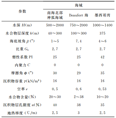 表 1中,水深、水合物层深度、海底坡角等参数可通过该区域的地震剖面资料确定;水合物含量、沉积物层孔隙度、地热梯度等参数通过具体的钻样及勘测数据得出;比重、塑性系数、内聚力、摩擦角、沉积物容重、空率等参数通过综合对比国内外相关文献得出.