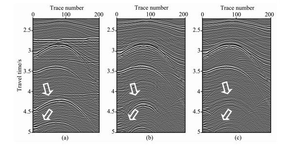 图 4是SMARRT Pluto1.5模型原始叠加剖面, 箭头指示的是多次波的位置; 图 5是单道最小二乘匹配去多次波后的叠加剖面; 图 6是均衡多道1范数最小匹配去多次波后的叠加剖面; 图 7是图 4、5、中框①的放大显示, 其中图 7a是原始记录, 图 7b是应用单道最小二乘匹配去多次波后的结果, 图 7c是应用均衡多道1范数最小匹配去多次波后的结果, 可以看到单道最小二乘匹配方法存在匹配不足或过匹配, 均衡多道1范数最小匹配多次波压制比较干净, 一次波能量保持得比较完整, 同时使得被其覆盖的一次波同相轴更加连续.