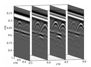 图 7 测线探地雷达切片图y=0.3 m, 0.4 m, 0.5 m, 0.6 m Fig. 7 Comparison of the GPR slices at y=0.3 m, 0.4 m, 0.5 m, 0.6 m |