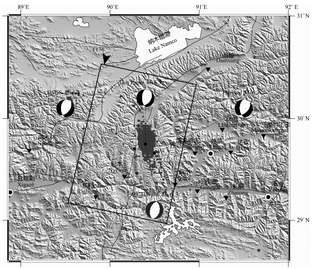 图 1 当雄地区构造背景场 灰色点为震后余震分布(www.csi.ac.cn),黑线为断层,黑线框为ASAR数据空间位置,倒三角为县城所在地. Fig. 1 Topographic and tectonic background of the 2008 Damxung Earthquake Gray dots represent aftershocks (www.csi.ac.cn), black lines indicate faults, black frame delimits the coverage of the ASAR images used in this study, and triangles mark the county towns. |