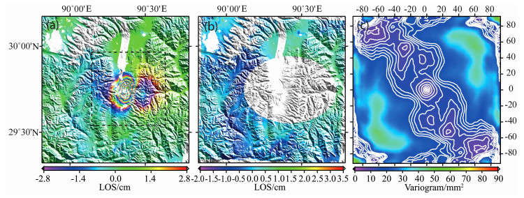 首先,对干涉位移场中震中附近主要的形变区进行掩模处理,只保留非形变信息的远场噪声.如图 2b所示,噪声在-2~3.5cm范围内摆动.然后,根据(1)式